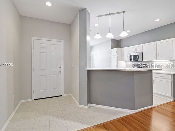This updated Adirondack-style Andover cottage near a quiet cul-de-sac features an open-concept layout with two bedrooms, a den/office, and two bathrooms. Highlights include an eat-in kitchen with quartz counters and stainless appliances, a screened porch overlooking a wooded view, a two-car garage with a deep sink, and beautiful landscaping with maintenance included. The spacious floor plan offers plenty of natural light throughout, creating a warm and inviting atmosphere. Recent updates ensure modern comfort, while the tranquil setting provides a peaceful retreat from the hustle and bustle. Conveniently located near Hidden Cypress Amenity Center and Veterans Memorial Sports Field, the home is move-in ready for enjoying the Sun City lifestyle.
