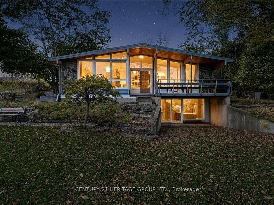 Direct waterfront retreatPrivate tree-lined lotExpansive south-facing viewsSun-drenched open-concept layoutGleaming wood cathedral ceilingsWarm accent wallsFloor-to-ceiling windows