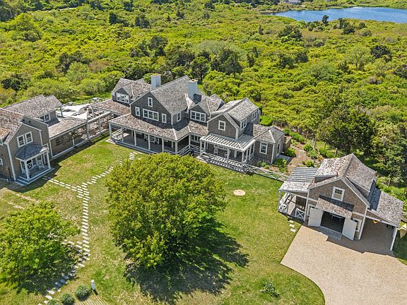 - A, AC, Ins, Irr, OSh, Floor 1: Main House - built by Ed Toole in 2001 and designed by the late renowned Island architect Gwynne Thorsen, its classic twin chimneys design remains brilliant today. The wide covered front porch with its welcoming Dutch door opens into a large foyer with white-washed pine flooring and dual staircases. The central living room features a double-sided wood burning fireplace to warm any dinner party guests seated nearby and large French doors opening onto the pool deck with first floor water views. Beyond the dining room is the kitchen with a concrete center island, sitting area, access to the deck and proper mud room with laundry. The mudroom opens onto a large deer-proof flower garden designed by the owner, a nationally recognized floral designer. At the opposite end of the house is a hallway with a powder room, first floor bedroom with private bathroom and French doors opening to the pool area., Floor 2: The 2nd floor features a grand living room with gas fireplace and balcony, boasting wonderful views of the harbor and beyond Coatue where the summer yachts are moored. To the south is the primary bedroom with its own balcony and primary bathroom. To the North there are two identical guest rooms, both with private bathrooms. Extensive built-ins minimize clutter and each room is light filled with vaulted ceilings.
