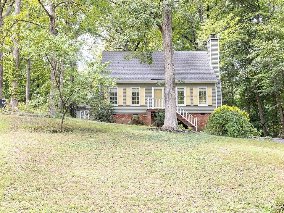 Nestled on a quiet cul-de-sac, this charming 3 bedroom, 2 bathroom cape style home offers a perfect blend of comfort and style. The inviting living room is highlighted by a wood burning fireplace and elegant molding details that add a touch of sophistication. The formal dining room is equally impressive, featuring crown molding, chair rail detail, and a beautiful chandelier that sets the stage for memorable gatherings. The eat-in kitchen is a delightful blend of classic and modern, with wainscoting, stainless steel appliances, and open shelving. Down the hall, you'll find a first floor bedroom, making it an ideal option for a primary suite, guest room, or private home office. The main level also includes a convenient full hall bathroom and a separate laundry room with ample cabinetry for added storage. Upstairs, two generously sized bedrooms provide comfortable living spaces, with one offering a large walk-in closet. The entire upstairs, including the hallway, stairwell, and banister, was recently painted, giving the space a fresh, updated feel. A shared hall bathroom serves the upper level, completing the home’s thoughtful layout. The detached shed offers additional storage, keeping your outdoor space tidy and organized. This home is conveniently located a short drive from Hull Street Road and Route 288 - providing easy access to shopping and dining options like Chesterfield Towne Center and Westchester Commons. Enjoy proximity to outdoor recreation with numerous parks, such as Rockwood Park and Pocahontas State Park, nearby offering hiking trails, sports facilities, and picnic areas, perfect for weekend activities! Come see all this home has to offer and book your showing today!