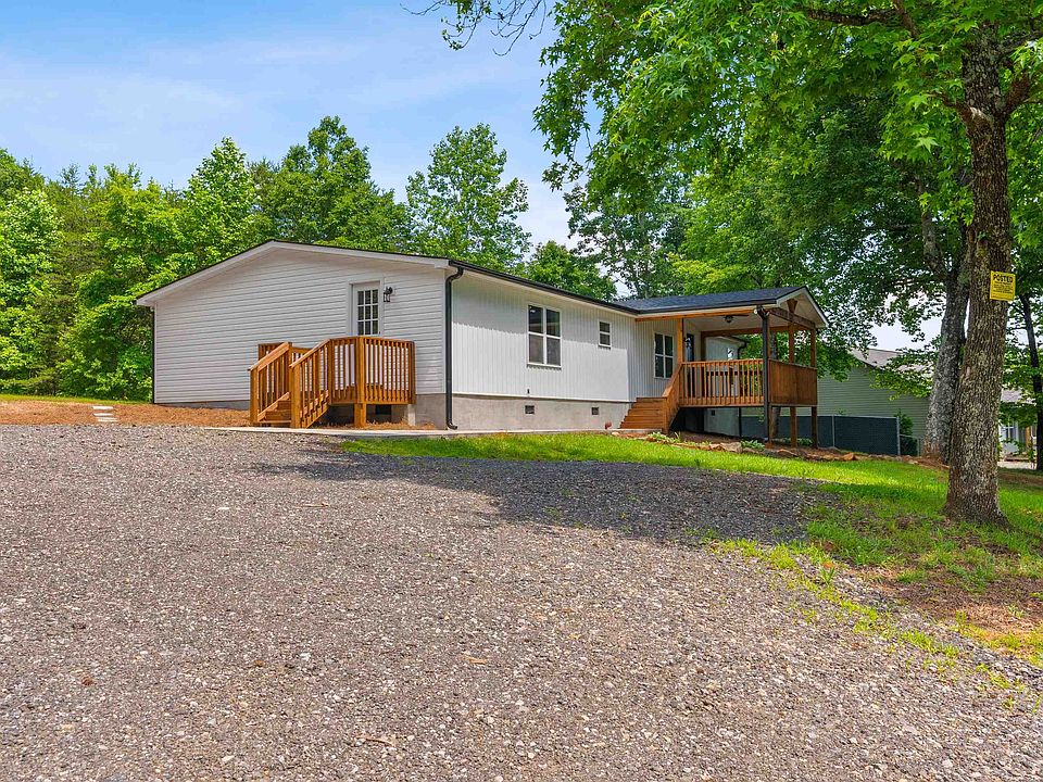 Perfect Blue Ridge location just off Highway 101! With almost 1700 square feet this renovated home will knock your socks off! The over one acre lot will be a great place for a pool or even an amazing summer garden! Gravel driveway with crushed asphalt has plenty of parking for multiple cars. The oversized covered porch will be one of your favorite places to watch nature, relax after a hard day, and stay cool by the fan. Inside, luxury vinyl plank floors are everywhere with exception of new carpet in the bedrooms. The large living room is open to kitchen and has sliding doors onto a new deck overlooking the wooded backdrop of your backyard. The kitchen has been updated with new cabinets, granite countertops, stainless steel appliances, updated light fixtures, and there is even a smaller walk in pantry! Plenty of LED recessed lights flow through entire living area. The owner's suite has a large walk in closet with custom shelving. Dual vanity in master bath has marble counter tops, and an elegant design. The tub with tile surround adds a luxurious feel to this space. There is also linen closet. The split floor plan offers much privacy for the owner, has a gorgeous vanity in the bathroom, and a full tile shower. The laundry room has cabinetry over the washer/dryer area and a custom built drop zone with hooks, shiplap, and a heart of pine seat that is stunning. Home is detitled, has been termite treated (bond in place), on a permanent foundation, and is ready for immediate occupancy! Some see this precious home today!