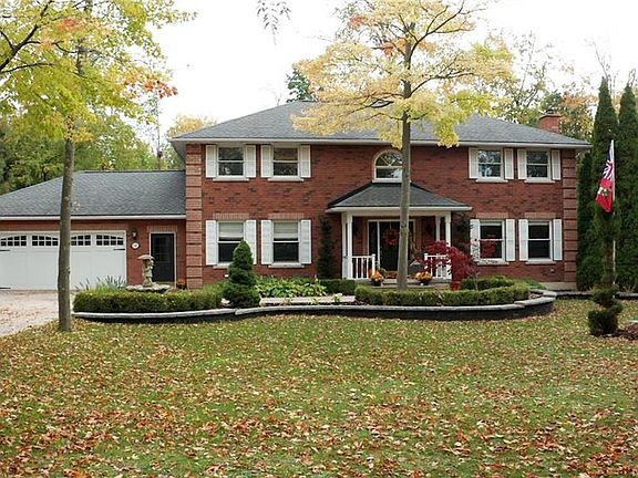 The curb appeal on this home is the envy of the neighbourhood. This warm and inviting 4+1 bedroom, 3 bathroom stately home is ready for a new family. A mature maple lined driveway with wrought iron gates escorts you to this spectacular executive home with over 3,000 sq feet of living space. The layout lends perfectly for family living and entertaining. The rooms are spacious and elegant. Enter the grand foyer with soaring ceilings, large windows, and a combination of rich dark flooring, vinyl plank & ceramic tile. The main level features a classic centre hall floor plan with spacious principal rooms incl. formal living & dining room with french doors, den, custom kitchen with quartz countertops, plus an oversized island. The 2nd floor features 4 large bedrooms plus two stunning updated bathrooms, one being a private luxurious ensuite. The backyard has a beautiful mixture of open space, a gorgeous covered patio with stamp concrete, built-in gas bbq, and fire table all on a half-acre lot, making this an ideal place to unwind. If you are seeking sanctuary in a quiet rural setting then this should be on your must see list. The perfect balance of rural beauty and urban amenities at your fingertips!