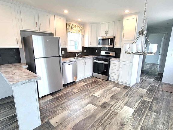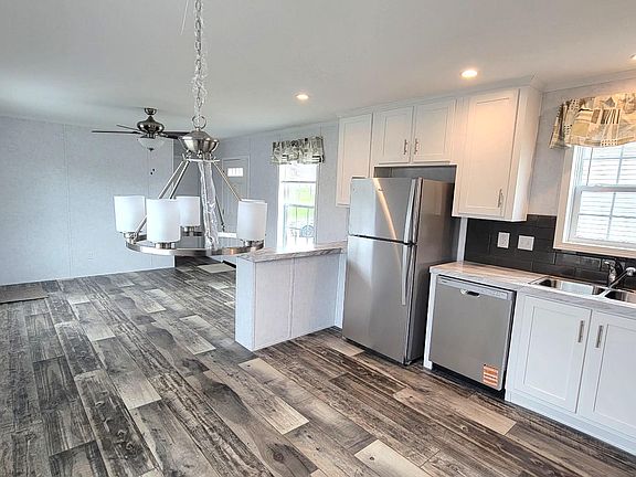 This brand new 2025 2 bedroom home comes with a 1 year manufacturer warranty and an addtitional 6 year limited warranty. The kitchen has beautiful white cabinets, slow close doors, crown molding, stainless steel appliances(whirlpool) and generous amount of cabinets including a large pantry. The L shaped kitchen includes a convenient breadfast bar. The home comes with a dishwasher, built in microwave, gas stove and a fridge. The main bedroom(11x10) has a large closet which is 8 ft wide inside. Most windows come with blinds and window treatments. Come view this beautiful home and start your next chapter here. Lot rent is $561 and includes sewer and trash. Room sizes are approximate and are rounded to the closest whole number.
