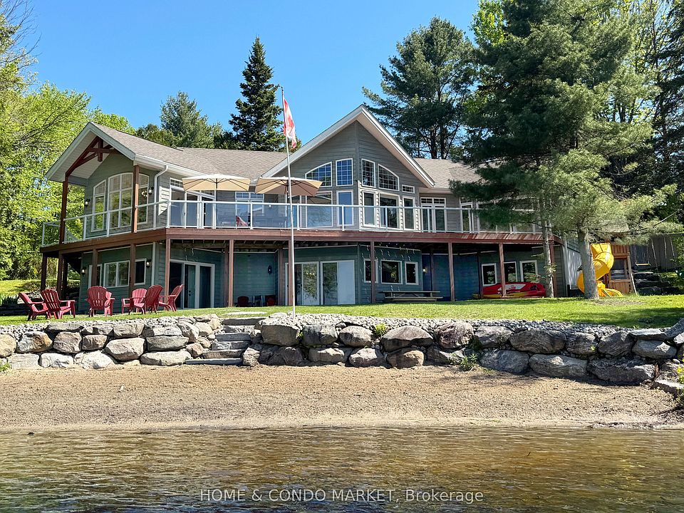 This is where family memories are made. Nestled on a rare crescent-shaped waterfront lot with coveted western exposure and long-lake views, this 4-season, 5-bedroom, 3-bathroom luxury cottage offers all-day sun and unforgettable sunsets over prestigious Manitouwabing Lake. 3200+ sq ft of finished space built by Cedarland Homes. The main living space features vaulted ceilings, rustic wood beams, and full-height windows framing panoramic views of the bay. The open concept kitchen, complete with breakfast bar, flows into the great room and dining area stepping out to a full-width deck with elevated lake vistas and a covered patio below. Your private sandy beach and shallow walk-in shoreline are ideal for kids, while the dock is perfect for fishing and boating. The walk-out lower level, finished in 2023, includes a family room, wet bar, games room, laundry and bathroom all designed for comfort and entertaining. Extras include double garage with hydro, municipally maintained road access, and an exclusive cul-de-sac with just 5 homes. Located just minutes from Manitou Ridge Golf Course, local bistro, butcher and General Store. Under 25 minutes to full service amenities in Parry Sound including, hospital, dining and shopping, plus amenities in neighbouring Muskoka. Whether you are seeking a private family haven or an investment-grade waterfront property, this home is move-in ready and made for lakeside living.