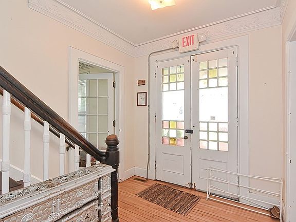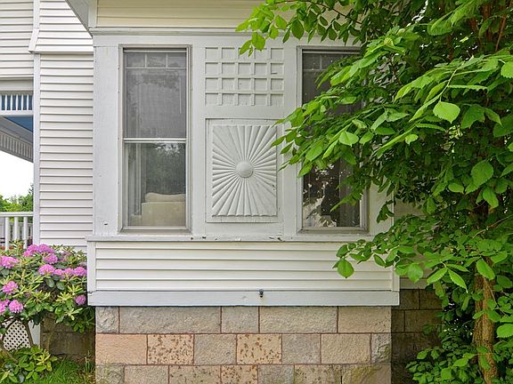 Colonial with a one-car garage, side farmers porch to an entry foyer with access to the front living room with a fireplace and crown molding, dining room with bay window and fireplace, a large eat-in kitchen with upgraded cabinets, tile flooring, a main floor laundry room. The second floor features three full-size bedrooms and a full bath. Period details remain that include hardwood flooring, 3 fireplaces all with custom mantles, crown molding, built-in storage, and stain glass double side entry doors. Amenities include upgraded gas HVAC and hot water tank.