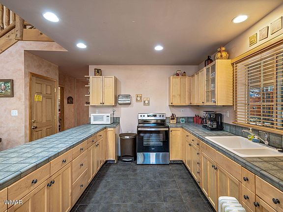 RUSTIC AND CHARMING, CUSTOM LOG CHALET STYLE CABIN. BEAUTIFUL CATHEDRAL CEILINGS REACHING TO THE SKY, LINED WITH PINE TONGUE AND GROOVE. COZY UP WITH A CUP OF HOT COCOA BY THE MASSIVE ROCK, FLOOR TO CEILING, WOOD BURNING FIREPLACE. ENJOY YOUR FAVORITE BEVERAGE ON A LARGE WRAP AROUND DECK PERFECT FOR BBQ'S AND GATHERINGS. FURNISHINGS TO CONVEY FOR QUICK MOVE IN. SLEEPS 11+ EASLY. EXTREMELY SPACIOUS MASTER SUITE NESTLED UPSTAIRS WITH PRIVATE BATHROOM AND CLAWFOOT TUB AND RELAXING LOFT FOR READING OR GAMES WHILE LOOKING OUT THE GORGEOUS CLERESTORY WINDOWS AT THE SWAYING TALL PINES & HANDSCRAPED WOOD FLOORS!. HUGE UNFINISHED BASEMENT-GREAT POTENTIAL!
