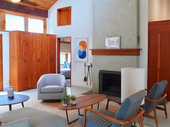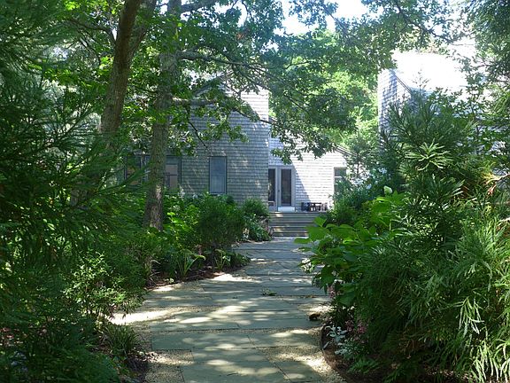 This hypnotic retreat on 4+ acres is sited on a north-facing bluff above 1300 feet of beachfront in Pilot Hill Farm, off Lambert's Cove Road. The Farm is comprised of 200 acres, about 1/2 of which is conserved woodlands, beach, fields and trails. Buy your fresh eggs and produce right at the Farm! The exciting contemporary home is comprised of 3 "pods" connected by 1600 sq.ft. of decking. All have dramatic cathedral ceilings and walls of windows that bring in the water views and flood the home with light. The core of the house has an open floor plan with a central fireplace in the living room, a spacious dining area and two bedrooms, each with their own baths. The primary suite is set apart unto itself and has a lovely sitting area, walk-in closet with floor to ceiling built-ins and a handsome bath. The two-story guest suite across the deck has a large ground-floor sitting room with wood stove, a bath beautifully updated in 2016, a walk-in closet and a loft bedroom. All three structures are wrapped in the most gorgeous gardens. Full basement, drive-under garage and a generator. Enjoy a beach at your doorstep, magical gardens and mesmerizing ocean views at this idyllic property. JUNE 2023 UPDATE: Installation of A/C just completed; home refreshed and redecorated; all new storm/screen doors; all exterior trim newly painted and whole property power washed.