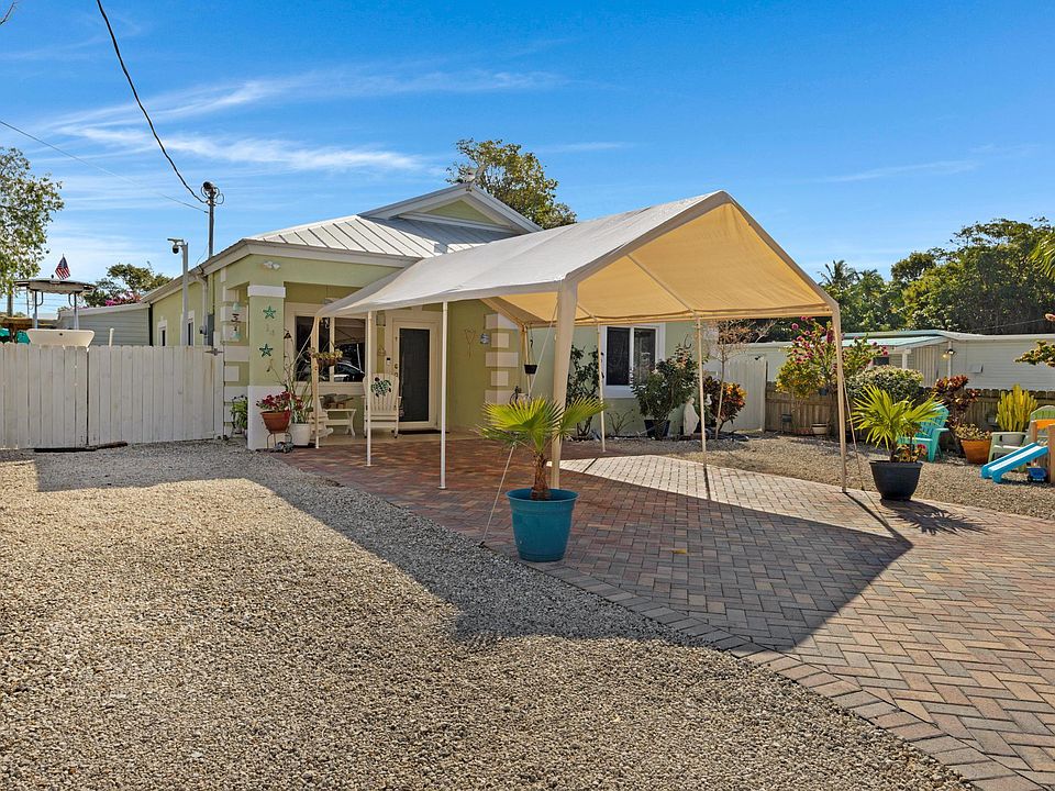 This beautifully maintained 3-bedroom, 2-bathroom CBS home in Key Largo offers luxury, comfort, and convenience. Owned by the original owners, this home features a metal roof, impact windows and doors, and is in the desirable X flood zone. Inside, you'll find elegant, easy-to-clean porcelain floors, high ceilings, and an open-concept living area. The stylish kitchen boasts modern quartz countertops with a countertop overhang and seating, a tiled backsplash, and stainless-steel appliances. It's truly a chef's delight. The primary suite sits off the kitchen and boasts an ensuite 5-piece bath with a separate sizable closet. The split bedroom floorplan offers privacy, separating the primary suite from the other bedrooms, which can function perfectly as guest rooms or a home office. Bedrooms feature black out blinds for easy sleeping. This home is perfectly equipped with a 2022 Titan on demand water heater, and central AC/Heat ensuring year-round comfort. Step outside, to enjoy the front porch or the privacy of the back terrace- where a gardener's paradise awaits with ample shade, vibrant flowers, and a cozy pergola(approx.16'x13') perfect for reading, sitting or entertaining. Enjoy a private oasis within the confines of the wood-fenced yard, offering secure storage for your boat and other recreational toys. A 10'x6' (approx.) storage shed provides ample space for fishing gear and more, while the convenient outdoor sink simplifies cleanup after gardening or a day on the water. The thoughtfully designed property features a brick-paved driveway in the front, accommodating multiple vehicles with room for more. This homes ideally situated within a few miles of several boat ramps, shopping, grocery store and a variety of dining options. Additionally, it makes for an easy commute to the mainland for both work and leisure. This exceptional Key Largo opportunity won't last - schedule your private showing today!