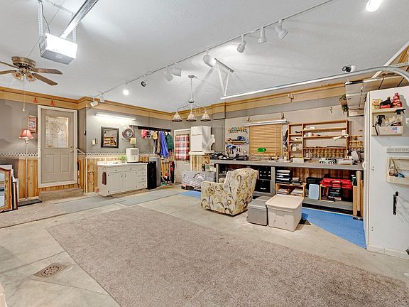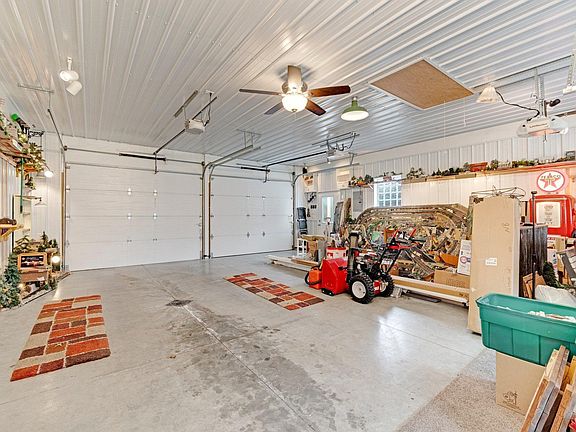 Now connected to City Sewer! Become the proud new owner of this spacious ranch with a full basement, offering over 3,200 sq ft of finished living space. This 3-bedroom, 3.5-bath home also includes 2 offices, perfect for work or hobbies. From the moment you pull into the 6-inch thick, extended concrete driveway—rated for large RVs—you’re welcomed by a meticulously maintained property full of charm, storage, and lake amenities. Start your tour in the oversized, heated, and humidity-controlled 2-car garage, equipped with a workbench, storage options, adjustable lighting, and a wash sink. Inside, a half bath and laundry room serve as a practical mudroom. The upstairs kitchen is a culinary dream with custom hardwood cabinets and more counter space than you’ll know what to do with, along with an eat-in dining area and bar. Just off the kitchen is a four-seasons room with a hot tub. All three bedrooms are located on the west side of the home. The two guest bedrooms share a full bath, while the primary suite includes its own private ensuite. Downstairs, the dry basement features two dedicated offices—one with access to walk-in storage that can double as a storm shelter—a large full bath, an expansive living area, and a second full kitchen with fridge and stove. Outside is just as impressive, with well-manicured landscaping including trees, shrubs, ornamental grasses, and a variety of perennials. Strategically planted trees offer privacy and seclusion. A utility shed has been converted into a tranquil hobby space and houses the controls for an outdoor Christmas light display. The fully insulated and heated detached 3-car garage has a finished interior, transforming it into a functional space to enjoy lake views and sunsets. Nearby, a large pole barn serves as an oversized workshop, featuring a garage door and sliding barn door for larger projects. Inside, you'll find a peaceful lounge area highlighted by a 100-year-old live-edge feature—perfect for entertaining or cozy nights by the fireplace. At the rear of the property, a split-section dock awaits: one side offers a quiet place to fish and relax, while the other is set up for entertainment, complete with space to pour drinks and play games. This is a must-see property for 2025!