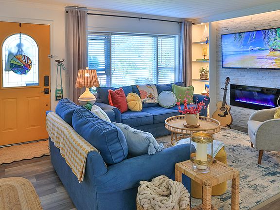 Discover your dream starter home — a beautifully updated 2-bedroom, 1-bath gem offering charm, comfort, and an unbeatable value! The roof, central air and electric panel have all been replaced in 2024! This home is truly move-in ready and designed for modern living! Step into the inviting living room, where a striking stone fireplace wall with an electric fireplace, built-in shelving, and elegant LED lighting sets the perfect ambiance! Easy-care LVP flooring flows seamlessly throughout, enhancing the spacious feel of the common areas! The thoughtfully designed kitchen boasts maple cabinetry, sleek quartz countertops, and stainless-steel appliances, maximizing both style and functionality! Every detail has been carefully curated to make this space as practical as it is beautiful! The fully remodeled bathroom features stylish tile flooring, floor-to-ceiling tiled shower walls, and a charming farmhouse vanity! Conveniently located, the spacious laundry room includes an eight-foot closet and generous pantry shelving for all your storage needs! Enjoy year-round relaxation in the enclosed rear sunroom! Every inch of this home exudes quality, from the manicured front landscaping and the inviting tiled front porch to the elegant shiplap ceilings with crown molding! Practical additions like aluminum gutters, downspouts, and a keypad entry system further enhance its appeal. When you step outside you will find your private backyard oasis, complete with a swimming pool and deck the perfect spot to soak up the Florida sunshine! Nestled in a prime Port Orange location, this home is just a 5 minute drive to the beach with all the conveniences of coastal living! An ideal opportunity for first-time home buyers or savvy investors, this property won't last long! Schedule your showing today and experience the charm for yourself! There are no warranties expressed or implied. All measurements are approximate. Square footage received from tax rolls. All information recorded in the MLS intended to be accurate but cannot be guaranteed.