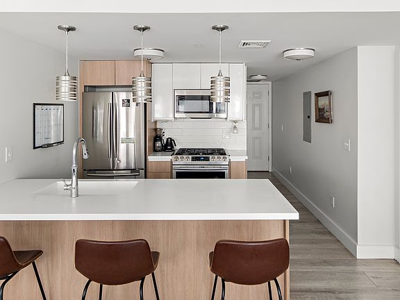 The modern kitchen is a chef's dream complete with stainless steel appliances, gas cooking, sleek white countertops, and a breakfast bar perfect for entertaining guests. Just down the hall, you'll find a convenient pantry and an in-unit stacked washer and dryer.