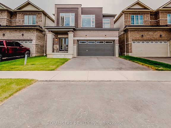 Introducing 14 Heming Street a beautifully designed modern home offering over 2,800 sq. ft. of sophisticated living space. This spacious 5-bedroom residence is perfect for growing families or professionals looking for a dedicated home office. The open-concept layout effortlessly connects the living, dining, and kitchen areas, all enhanced by 9-foot ceilings and expansive windows fitted with contemporary blinds, creating a bright and welcoming ambiance. The chef-inspired kitchen features a large center island with a breakfast bar, elegant hardwood cabinetry, and plentiful storage space. The primary suite offers a true retreat, complete with two walk-in closets one impressively sized, almost like a separate room. Additional highlights include a grand double-door main entry and a private side entrance to the basement, providing added convenience and potential for future customization. Ideally situated within walking distance to local schools, a scenic pond, and just minutes from shopping, gas stations, and the Grand River, this home combines modern style, functional design, and a prime location.