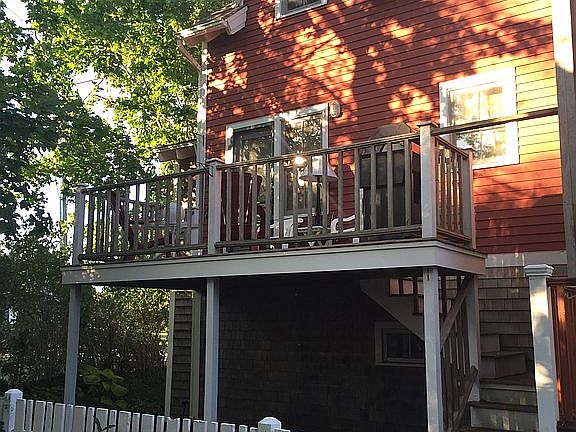 3 level town house on a quiet lane. The unit is surrounded by mature trees that provide privacy & shade. The exclusive use garden has perennial plantings. 2 parking spaces & visitor parking off the lane. The first level has a spacious heated garage plus W/D and storage space. A vaulted stairwell leads to the main floor living/dining room/kitchen with windows on three sides, a unique Malm freestanding fireplace, and a French door that opens to a private deck in the back. The galley kitchen has an open pass-through, a large built-in pantry, beech-wood cabinets and newer appliances. The floors are rustic style wide board yellow pine. The top level has a large w/w carpeted bedroom, a nice vaulted area and a spacious closet. Full bath with soaking tub and shower in the hallway. Less than a 10 minute walk to themcenter of town.
