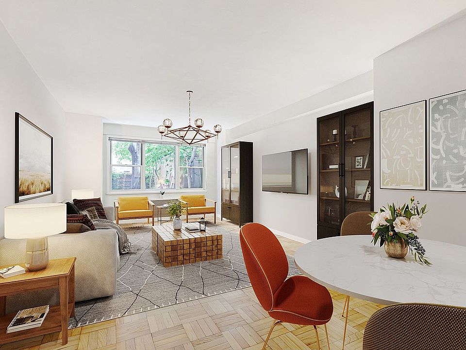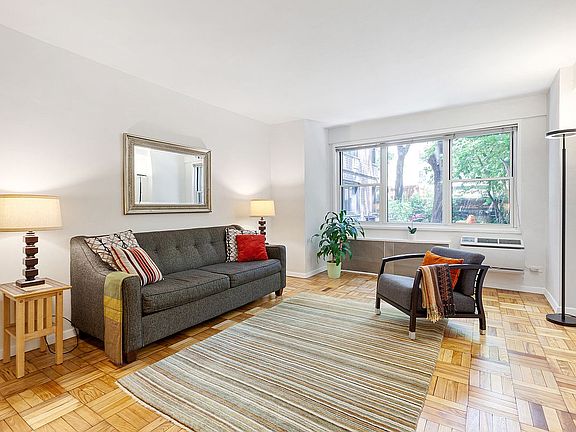 Expansive pin drop quiet alcove studio with garden views. Exceptional layout marvelously designed for creating distinct living areas, including a living room, sleeping alcove, dining area, and/or office. Numerous deep closets including a walk-in. Great storage. Original, midcentury cabinetry in the kitchen and classic tilework in the bathroom. Gorgeous hardwood floors throughout. Low maintenance for an apartment of its size.