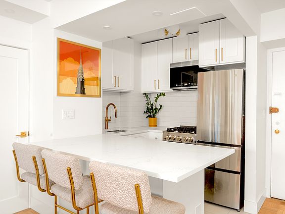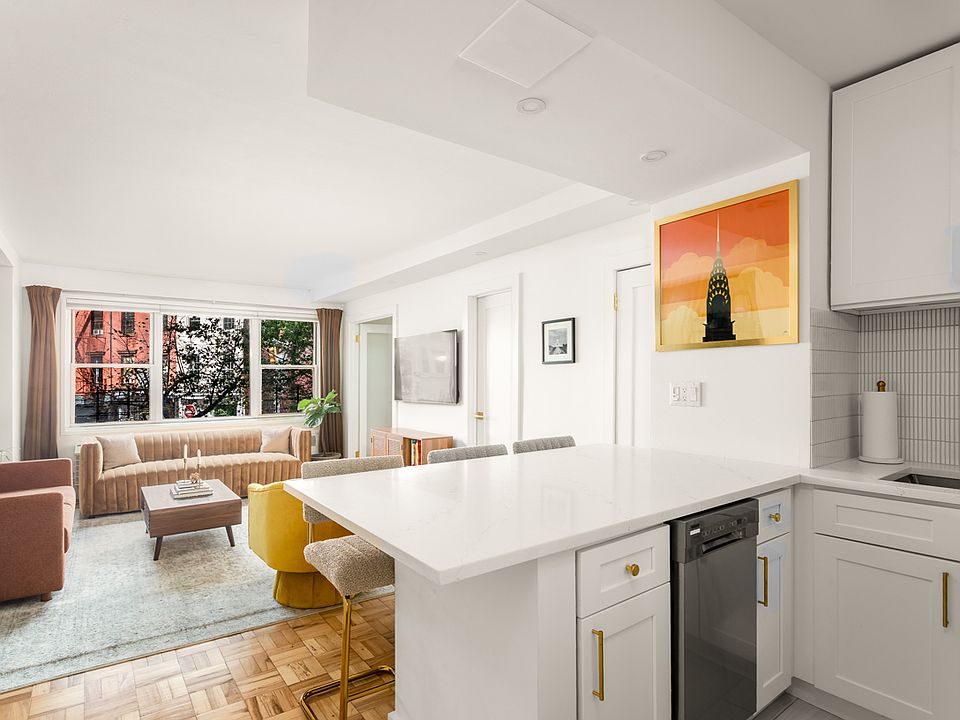 Fully renovated junior one-bedroom at 14 Horatio Street in the heart of the West Village. This bright, west-facing apartment spans approximately 500 square feet and features oversized windows with lovely light and treetop views. The spacious layout includes a proper bedroom that fits a queen-sized bed, three generous closets, and a stunning new kitchen with quartz countertops, custom cabinetry, and stainless steel appliances including a gas range, dishwasher, and refrigerator. The bathroom was completely gut-renovated with modern finishes and high-end fixtures.