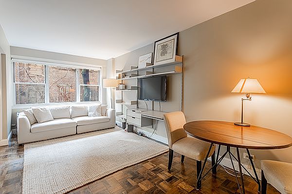 Beautiful junior one bedroom has new renovation. Offered for rent for one year lease with an option for a second year. Furnished. Gourmet kitchen with microwave and dishwasher has everything. Bedroom has sliding doors to close or open. Bed, large sofa, wall unit, dining table, chairs and large television set all stay. Includes bedroom and bathroom linens. Quiet south and east exposures face over gardens and the back of buildings. Full service building has 24 hour Doormen, live in Superintendent and Porters daily. Wonderful roof deck has plants, seating and WiFi. Basement laundry room is all digital and open 24 hours. Filtered water for the entire building. Shown by appointment.