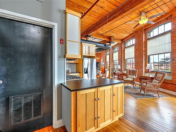 This light filled loft in the Imperial Place complex with over 1,100 SF of living space is sure to please. This 4th floor corner unit has amazing views across the cityscape. Look north to Downtown Providence, to the east and south for glimpses of the historic East Side and waterfront. Step into the entry and be immediately impressed with the exposed brick walls, original restored wood floors and 12' beamed ceilings. The large open living area has ample space for casual living. A dining nook has built-in honey toned wood cabinetry that carries into the fully equipped kitchen with stainless appliances, a tile backsplash and ample counterspace. A private study or home office provides the perfect space to telecommute. The sleeping area includes large closets with built-ins and access to the generous full tile bath with double vanity and a tile tub and shower. There is a separate laundry area and storage space. This highly sought after loft community is just steps to entertainment, restaurants, parks and Trader Joe's. Enjoy the convenience of an off-street parking space and easy access to commuter routes and the train station. You will not want to miss this amazing unit!