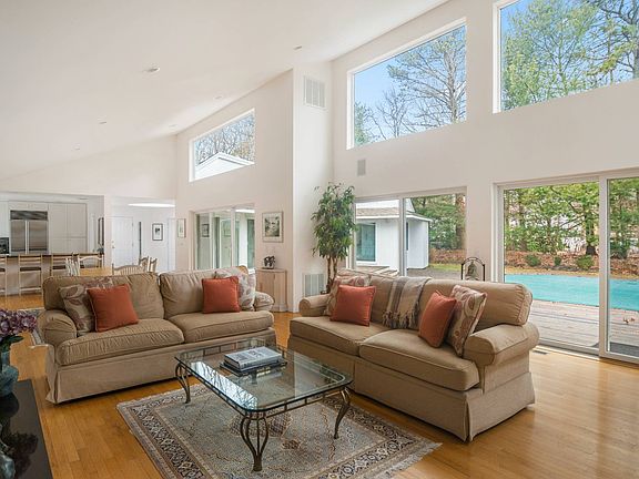 Down a private lane awaits this hidden gem. Open and filled with light the first floor hosts a great room with fireplace and built-in bookcases, a large renovated kitchen, a junior primary en suite bedroom, two guest bedrooms, hall bath and a powder room. The spacious primary suite with spa bath is set on the second floor for added privacy. An expansive deck is perfect for outdoor entertaining. A heated gunite pool, outdoor shower and a recently added outdoor pergola with a living room area create the perfect summer getaway. Access to the residents-only Quogue Village Beach.