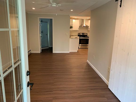 HARTLAND HIDDEN GEM - NEW RENOVATION, 1-Bedroom, 1-Bath Apartment located on a secluded cul-de-sac near Hartland Center, very convenient to Rte 91 (15 mins from West Lebanon / 20 mins from Dartmouth-Hitchcock). Double French Doors provide plenty of sunlight and lead out to a private garden area with views of Mt. Ascutney. Open concept layout with spacious Living Room featuring white-washed sliding barn door entrance to bedroom. Modern Kitchen with white Shaker cabinets, open shelves, Stainless-Steel Refrigerator, electric stove, and pantry storage. Bathroom has plenty of light and features a sleek frameless shower design and pearl gray vanity. Whisper-quiet ceiling fans and plenty of outlets throughout. This garden level unit is part of a single-family home.