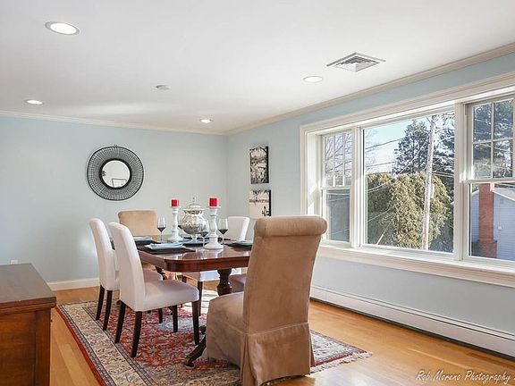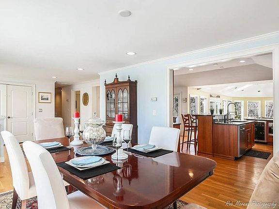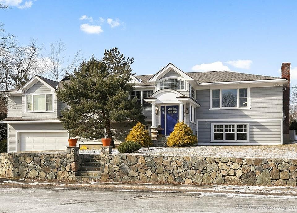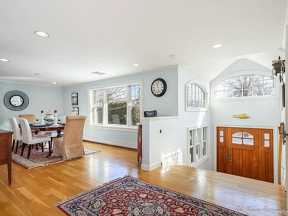 This large and renovated open concept Contemporary home is located on over a 17,000 square foot lot, abutting conservation land. The living room is bright and sunny with skylights and surrounded by windows with a door leading out to a private deck. The eat-in kitchen is updated and open to the living room with a breakfast bar and kitchen table This home has a large dining room with hardwood floors. The main level includes four bedrooms, three bathrooms and one half bathroom. One bedroom has an en-suite full bathroom and the master suite is situated with a large bedroom with two closets, one being a walk-in closet and a spacious bath with walk-in shower and soaking tub. The lower level is finished and includes a large family room with a fireplace and windows not allow sunlight, an office or fifth bedroom, a laundry room with a half bathroom, and access to the heated oversized garage.