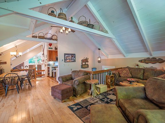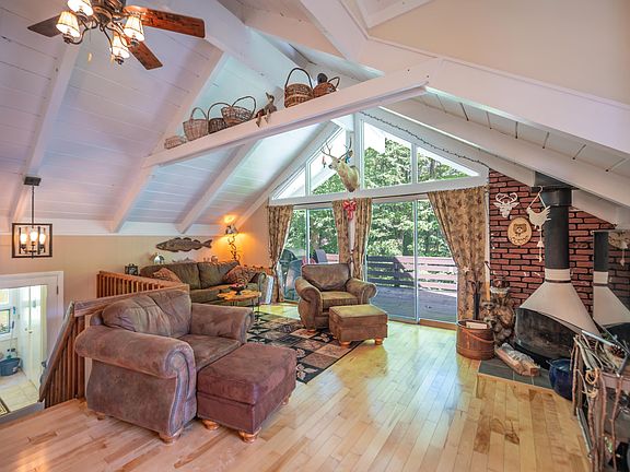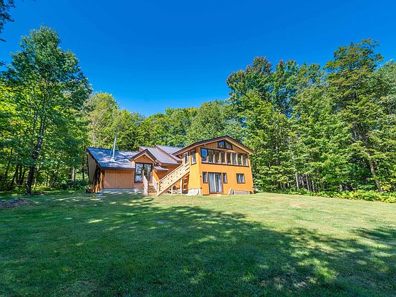 Unique contemporary chalet just a short drive from the Mount Snow Ski Resort and village Wilmington, and with direct snowmobile trail access. This very cool open concept home has been completely renovated and upgraded, and sits on a on a private lot in the Dover Hills with beautiful lawn space and cul de sac driveway. Walk in through the spacious mudroom with plenty of room for gear, and head up a half flight to the great room space with vaulted ceiling and exposed natural woodwork, great natural light thanks to large windows but a Vermonty rustic feel, wood floors throughout, a Scandinavian wood burning fireplace, and exposed beams, updated kitchen with custom cabinets, stainless appliances, and tiled accent wall, a second family room with wood stove and more large windows, as well as upscale full bath with soaking tub, and a large sun porch with bar area and windows to the winter view. The lower level has a primary suite with full bath and walkout access to the yard, two guest bedrooms, and a beautiful full guest bath with tiled shower and jetted whirlpool tub. Each bathroom has radiant floor heat, and further less obvious upgrades include a standing seam metal roof, snowmobile shed with electric, new rear stairs, and ample parking for all your guests.
