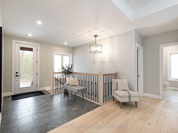 Step into modern comfort & contemporary style with this beautifully designed bungalow, built in 2023 & thoughtfully crafted for stylish everyday living. The homes striking curb appeal sets the tone; dark grey vinyl siding is paired with sleek black-framed windows & bold, modern black garage doors. A covered front porch invites you inside, where a bright & airy foyer leads into the open-concept main living area. Inside, 9ft ceilings & pale oak engineered hardwood flooring create a sense of spaciousness & warmth throughout the living, dining, & kitchen spaces. The heart of the home is a show-stopping kitchen that features quartz countertops, built-in appliances, a beverage fridge, & a large island with additional breakfast bar seating, ideal for casual meals or entertaining guests. The living room is anchored by a stylish electric fireplace with shiplap mantle accents. Step outside from the living area to an impressive 28' x 12' deck, perfect for BBQs or evening gatherings under the stars. Back inside, the spacious primary suite offers a quiet retreat, complete with a walk-in closet & a sleek 3-pc ensuite featuring heated floors for added comfort. On the opposite side of the home, you'll find 2 generous guest bedrooms & a well-appointed 4-pc bathroom, creating privacy & space for family or visitors. Practicality meets style in the large mudroom/laundry room, located just off the main living area. This space includes direct access to the double car garage, where you'll find extra ceiling height & its own dedicated propane heater, perfect for keeping vehicles warm in winter or creating a comfortable workspace year-round. The finished lower level offers even more versatility, with 2 additional bedrooms, a spacious 3-pc bathroom, & a large recreation room that can be customized to suit your needs. A separate entrance adds convenience & flexibility. This home blends clean modern design with functional living, all in a setting that offers both comfort & convenience.