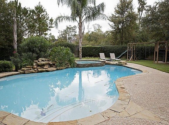 Beautiful and spacious 2-story David Weekley home on a corner lot in Sterling Ridge with salt water pool and spa surrounded by lush landscaping. Inside, the home has a large kitchen with island, built-in desk, gas cooktop, stainless steel appliances, and double oven, all adorned with granite and brick. Cathedral Family Room with fireplace and flanking art niches. Bay window and door from master bedroom to patio & pool area. Study has French Doors. Spacious bedrooms upstairs. Exemplary Schools.