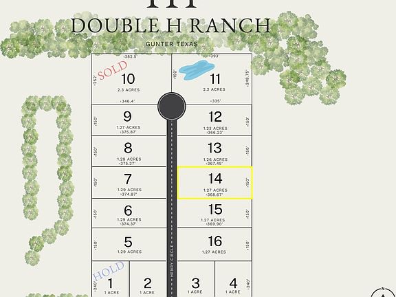 Welcome to Double H Ranch! Gunter's newest custom home neighborhood is coming soon! We are preselling lots now and taking lot holds. All homes to be built with local home builder Scott Post Homes. With just 16 homesites, Double H Ranch will have a single concrete road with a cul-de-sac with no thru traffic. All lots range from 1 to 2+ acres and have wide road frontage making the perfect proportion acre lots! The friendly neighbor with an existing home to the right of the property owns 9 acres and his home is located in the back so you won't have a home behind you! High end black metal fence lining the front yards to be installed, inspired by the outskirts of Nashville, TN. All floor plans and elevations can be totally custom. Estimated build time is 6-8 months. 14 lots remaining! Start building on Lots 1 and 4 now. Lot delivery for lots 2, 3, 5-16 post road completion. Taking lot holds on all lots now. Deed restrictions for quality and value of homes. Double H Ranch is the kind of place where neighbors wave from the porch, a place where legacy takes root. Our hope is that you and your family will feel just as connected here as we do. Let us help you create something meaningful and a place where you can settle into a home that’s truly special here in Gunter, Texas. As this was our family's previously owned land, we're proud to share this legacy with you! Model home located on Pike Rd in Gunter around the corner from Double H Ranch. SPECIAL LOW INTEREST RATE JUST LOWERED to 5.5% on our OTC loan program for our builds! Reach out with any questions.