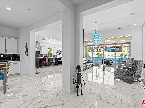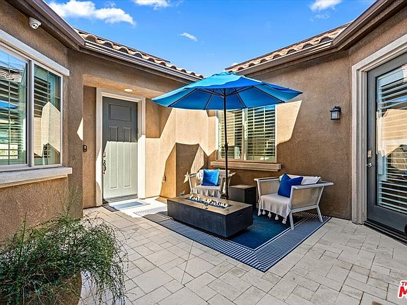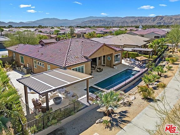 Welcome to 14 Merlot, located in a quiet pocket of Del Webb Rancho Mirage. Walking distance to the club house, where all the action takes place. This home is over 2500 sq ft of living space, it is an expanded version of the Journey model. When you arrive at this welcoming home, you see clean, detailed lines directing you to the fireplace in the living room and an outdoor oasis. The sparkling blue water pool is one of the longest in the community. It also has a spa and waterfalls. 2 Pergolas, covering the built in BBQ island outdoor kitchen. Inside the home, the kitchen is equipped with not one, but has 3 ovens, 2 full size and one convection. It is perfect for cooking your favorite meals. You will also see the largest Range from Kitchen Aid, stylish Quartz countertops throughout the home and backsplash in the kitchen. Ceramic tile flooring thought-out this home, the living room has a custom built in shelving with lighting, the home is pre-wired and a smart home. One of the most exciting things is the Premium stackable sliding doors, bring the outdoor in. Simply marvelous, as you enter the Primary bedroom, you see a second fireplace and an additional door to the outdoor playground. The spa like shower and large closet enhance the space. There is a casita/2nd bedroom has it's own entrance for your guests. The Office/den can be used as a 3rd bedroom. If you are looking for a home that is move-in ready, filled with the highest end of upgrades, this is it. There are 38 solar panels leased at $277.00/month. Do not miss this rare home.