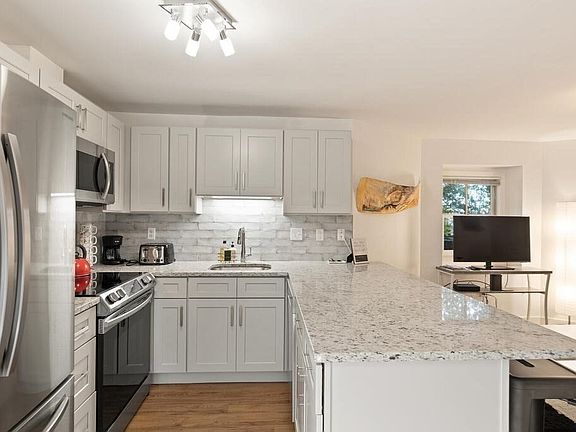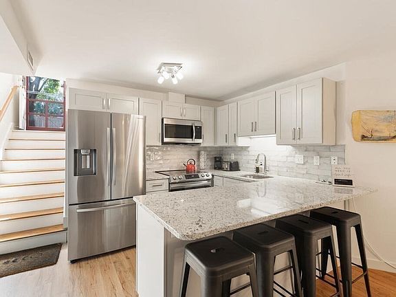 This newly renovated, 2 bedroom, 1 bath, Lower Level Condo offers convenience and parking in downtown Rockport , just steps to shops, restaurants, galleries, the Shalin Liu Performance Center, commuter rail, and beaches! This unit features an open floor plan featuring a sparkling kitchen w/ SS appliances, shaker cabinets, quartz countertops, subway tile, and peninsula with eating area for four, a spacious living room looking out to an exclusive-use side yard, a main bedroom with large walk-in closet, an all-new tiled bathroom with full-size stacked washer/dryer, & new HVAC and HW. There are 2 designated parking spaces, a private entry with sky-light just off the parking area, and a separate side entry with exclusive-use storage off the driveway. Nothing do to but move right in and start enjoying the many benefits of downtown living! This unit has been a very lucrative short term rental.