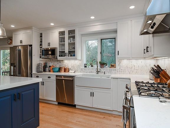 Welcome home! This quintessential New England cape is the one that you have been waiting for! Refinished maple floors run throughout the main level. 2017 remodel features an open layout from kitchen to dining room with a cozy wood-burning fireplace. The well appointed custom kitchen offers stainless steel appliances, a 9 foot island, and wine fridge. Two full baths feature updated tile flooring, newly tiled tub/shower surrounds, and stone-top vanities.Relocated office features wainscoting and built-in. Natural light abounds in the generously sized family room with cathedral ceilings and custom built-ins. Third zone HVAC added during the remodel. Perfect for indoor/outdoor living, there is slider access to the deck overlooking secluded backyard in a park-like setting. 2019 paver patio provides a way to enjoy the yard on the lower level where you can re-enter the house through the double glass doors leading to a finished basement providing additional living space. Don't miss this!!!