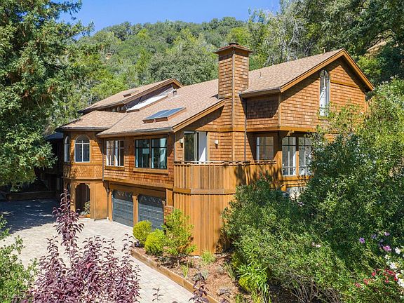 Nestled at the end of a leafy cul de sac in Pacheco Valle is a charming brown shingled 4 BD/ 3.5 BA + office home with vaulted, beam ceilings, wood floors and great indoor/ outdoor flow throughout. The grand scale living/dining room has a fireplace, floor length windows and access to a sun porch and deck. The updated kitchen has stainless steel appliances, stone countertops and backsplash, a walk-in pantry and a sun dappled eat in breakfast nook. Adjacent is a spacious family room opening out to the entertaining deck and yard. The entry level has a perfect guest suite with updated ensuite bathroom, a roomy storage room and access to the attached 2 car garage w/EV charger. The second level boasts 2 spacious vaulted ceiling bedrooms with walk-in closets, a full bathroom with tub/shower, an office, laundry and an open area for hangout or study. The airy and private primary suite also with vaulted ceilings has a private patio, sunlit updated bathroom and cedar closets. The home is perfectly sited on a 40,000 sf+ lot dotted with oaks and redwoods, a large flat turf lawn and multiple decks for play, entertaining and lounging. Live the dreamy, sun dappled California lifestyle while only moments from hiking trails and the freeway.