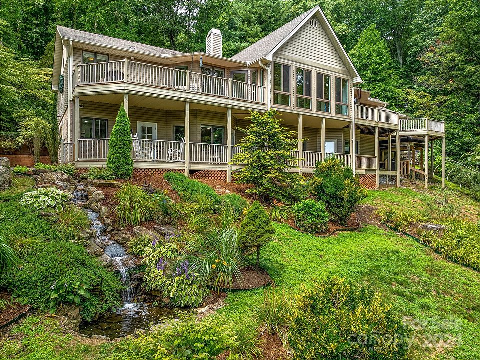 Step into a world of comfort and elegance in this recently updated gem nestled in almost 4 acres of natural beauty. As you enter, the open floor plan welcomes you with its seamless flow, connecting spacious living areas with abundant natural light. Make your way into the spacious kitchen boasting quartz countertops and Carrara marble tile backsplash for a fresh modern look. Venture to the lower level to find a thoughtfully designed separate living space, featuring a private kitchen and two bathrooms freshly updated to offer both convenience and cozy charm - perfect for entertaining or rental potential! The true magic of this home lies outdoors, where over 1,100 sqft of deck space including your own private hot tub and an over 200 sqft sunroom allows you to comfortably enjoy your surroundings. With two waterfall features, fruit trees, and mountain views this outdoor oasis is sure to wow anyone. The two garages and large storage area provide ample space for all of your essentials.