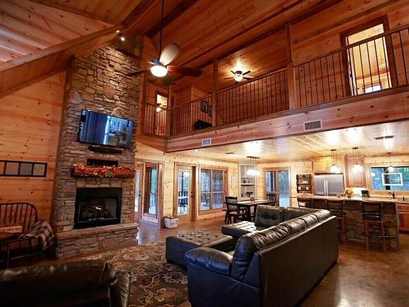 The open-concept main living area is both warm and inviting, with a striking stone fireplace, vaulted ceilings, and abundant natural light. The gourmet kitchen boasts custom cabinetry, granite countertops, and ample space for both everyday living and entertaining, seamlessly connecting to the dining and living rooms. The cabin can sleep up to 14 people.