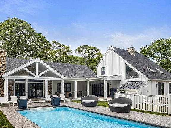 This stunning four-bedroom masterpiece has undergone a recent renovation, marrying timeless elegance with modern luxury. Step inside to discover a spacious interior adorned with premium finishes and thoughtful details at every turn. The main residence boasts three meticulously designed bedrooms, each offering a sanctuary of comfort and style. The primary bedroom and bath is found on the first level with an additional flex space used as an office. Two bedrooms with stylish barn doors are found on the upper level and are connected by a full bathroom. The gourmet kitchen has top of the line appliances with a large Quartz island. There is a dining room and living area with TV and gas fireplace is just off the kitchen. The spacious great room offers a second place to gather and watch TV. Venture outside and be greeted by an oasis of leisure and entertainment. The expansive outdoor living areas feature a pristine pool surrounded by lush landscaping. The separate Carriage House, complete with all the amenities needed for comfort including a bedroom, full bath and LR. Experience the epitome of coastal living in this Edgartown gem.