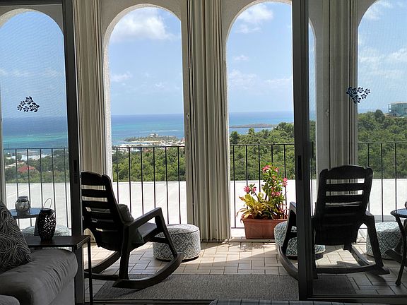 You will love the view from this 3 bedroom, 2.5 bath condo in desirable Queste Verde. Enjoy the lovely breeze and views both day and night of historic Christiansted harbor from the gallery and spacious great room. On the other side, the views are the pool out to the south shore. There are 3 bedrooms and 2 baths on the entry level. Upstairs an open concept kitchen, half bath and spacious great room with sliding doors to the gallery. Unit includes its own washer/dryer, and brand new ceiling fans up stairs. Amenities are a secure gated entry, automatic generator for back up power, a large pool, a cabana for entertaining and a coin operated laundry. The complex is nicely landscaped and well maintained, with on-site manager's office. Great location on St Croix, its close to everything.