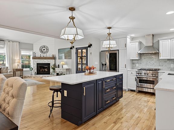Gas fireplaceOwn garageBold navy islandStylish interior finishesQuartz countertopsPrivate direct entryBrass lighting