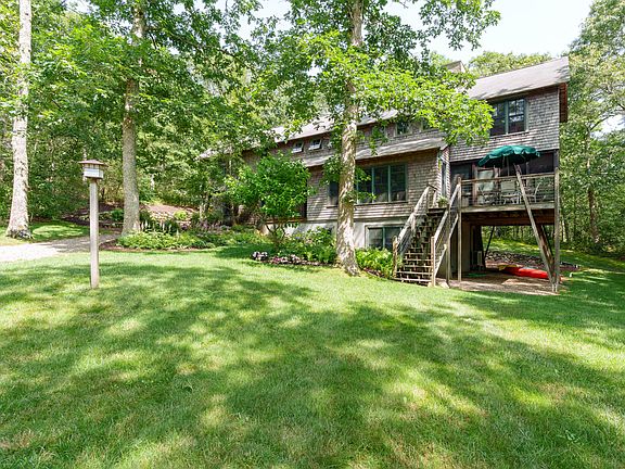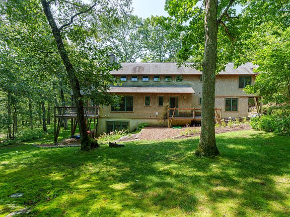 Affectionately referred to as 'The Treehouse', this property encompasses all the elements of a modern, sophisticated residence while providing the warmth and comfort of a private retreat. Professionally designed by Hutker Architects, this four-bedroom home, with a den/potential fifth bedroom, is sited in a private area, conveniently located with easy access to grocery store, pharmacy, and post office, and also to the island's most beautiful beach at Lambert's Cove. This home boasts meticulous attention to detail and exceptional craftsmanship. From the moment you step foot inside, you will notice the open floor plan design that creates a spacious and inviting atmosphere. Each of the four bedrooms has been thoughtfully designed and appointed to provide maximum comfort and privacy. The primary bedroom and ensuite bath and the den are at each end of the upper level, joined by a walkway across the living space. The main level also features a bedroom with ensuite bath, in addition to the large, open kitchen/dining/living space. Two more light-filled bedrooms plus a shared hall bath are located on the above-ground lower level. This is a meticulously maintained home with an open floor plan that is both functional and aesthetically pleasing. The open concept design includes a wood burning fireplace in the living room and a wonderful screened porch with open decks on either side. A back deck includes an outdoor shower.