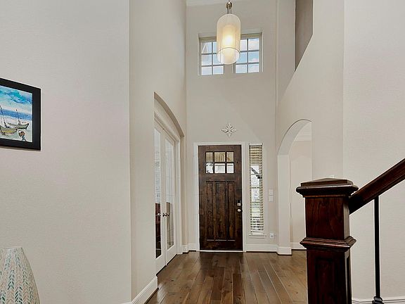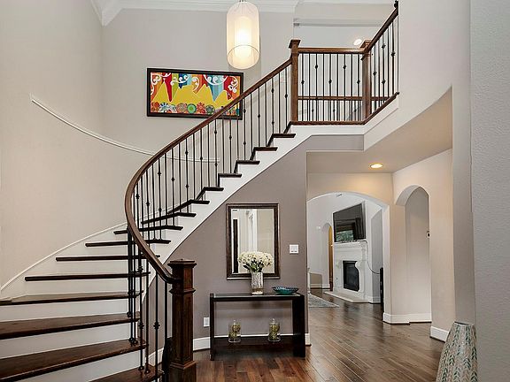 Stunning luxury residence in the highly coveted Liberty Branch community, beautifully situated on a premier corner lot with a private backyard retreat. This open-concept home offers 4 bedrooms, 3 full baths and a 3-car garage, blending sophisticated design with exceptional functionality. The main level showcases a dedicated study, refined wine room, mud area, an expansive primary suite, and a private guest bedroom with full bath. Upstairs features 2 additional bedrooms connected by a Jack-and-Jill bath, along with an oversized game room & media room ideal for entertaining. Architectural details include a charming front porch, sweeping iron staircase, soaring ceilings and rich hardwood floors throughout. The backyard oasis impresses with covered outdoor living, a fully equipped outdoor kitchen, and a tranquil resort-style pool. Roof replaced-2022, 1 HVAC-2023. Enjoy the unmatched lifestyle & amenities Creekside Park is renowned for, including schools, parks, trails, shopping and dining.