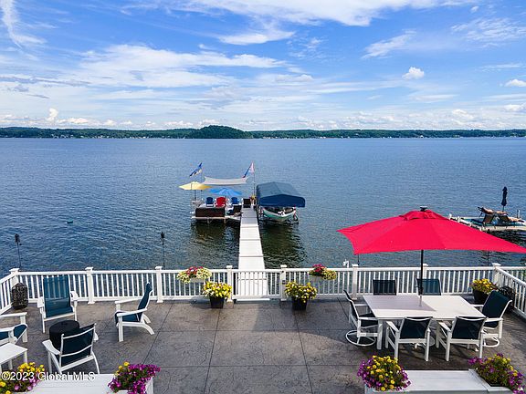 Welcome to lake living at its best in the sought after community of Riley Cove on Saratoga Lake. This year-round property is being sold furnished and boasts a warm Adirondack feel. Lakeside amenities include a stamped concrete waterfront deck, Shoremaster dock system, and a 4500 lb boat lift, The kitchen offers SS appliances including a Wolf 6 burner gas cook top & hood and double wall ovens, The hammered granite counters are accented by beautiful cherry cabinets & hickory floors. The sun room has large windows providing fabulous lake views & a wood burning stove. The bathrooms are nicely remodeled w/granite and quartz. The finished basement provides overflow sleeping/entertaining areas. The 3 car heated garage has a kitchen, half bath and large living areas. See assoc docs w/ amenities.