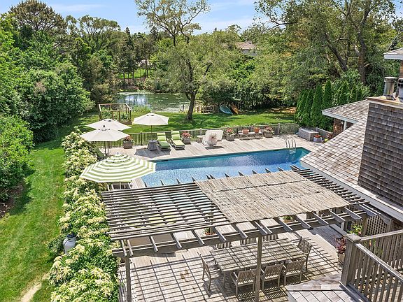 Upland Farms Waterfront. On one of the most Beautiful and Upscale Lanes in the area sits this Cedar Shaker Modern. Rolling Lawns Highlight the Stunning Mature Landscaping and the Serene Waterfront Setting. This Home Features a Huge Deck with an Asymmetrical Heated Pool, Dining Pergola and Lovely Views. There is both a Main Floor and a Second Floor Master, 3 Guest bedrooms, a Private office and a Bonus room. The updated kitchen features a Butler's pantry and a Wet Bar. A 2 Car garage and a Circular Driveway round out this Very Special Property.