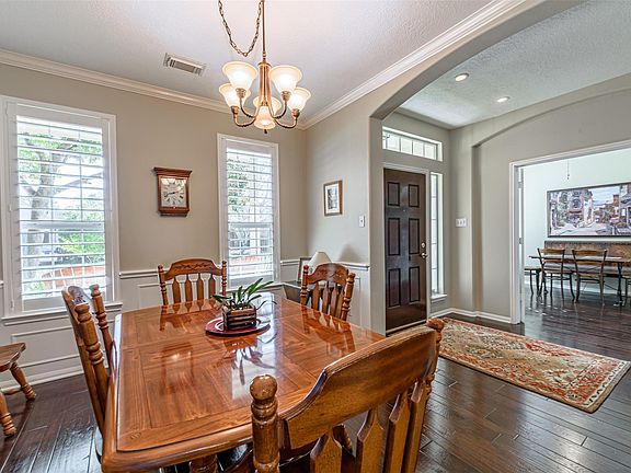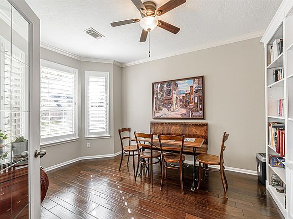 Gorgeous 2 story home in the Woodlands with great curb appeal and perfect for entertaining. The home features Formal dining, Study, Breakfast area, Primary bedroom first floor, 3 bedrooms and Game room upstairs. The entire home has custom shuttered windows, Hard wood floors in the main living areas, tile in the Kitchen and Breakfast room and carpet in the Bedrooms. The Primary bedroom has wonderful natural light, a large En-Suite bath with garden tub, frameless glass surround shower and a walk in closet. The Family room is on the first floor and opens directly into the Kitchen and Breakfast area. The Breakfast area has window seating and the Kitchen has bar seating making it perfect for entertaining. With three Bedrooms upstairs and the Game room there is plenty of space for friends and family, if that isn't enough there is an oversized backyard with concrete patio for outdoor entertaining.