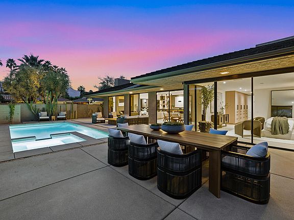 Welcome to a truly exceptional residence where style, comfort, and thoughtful design come together beautifully. This stunning property offers a blend of elegance and everyday livability, with light-filled spaces and a seamless flow throughout. The open-concept living area is perfect for both relaxed daily living and entertaining, while expansive windows bathe the home in natural light. The chef's kitchen is a standout, featuring Thermador appliances, generous prep space, large island and a layout designed to gather friends and family. Entertain with ease at the stunning custom bar, complete with ice maker and beverage center--a true showpiece designed for hosting in impressive style.Extensively upgraded with new HVAC systems, ducting, and water heaters, this home also features 19 panels of OWNED SOLAR with Tesla battery and an air-conditioned garage for year-round comfort and efficiency. Interior finishes include Level 5 smooth walls, raised ceilings, and 24' x 48' porcelain tile flooring throughout, creating a sleek, modern aesthetic. Additional bedrooms are well-appointed, offering comfort and flexibility for guests, family, or home office. Enjoy the ultimate in desert living with a south-facing pool and spa designed for both relaxation and entertaining- an ideal setting for morning swims, sunset gatherings, or peaceful evenings under the stars. Whether you're drawn to indoor-outdoor living, refined details, or a contemporary atmosphere, this home delivers it all! Located in the gated community of The Springs, you can enjoy an active lifestyle of golf, tennis, pickle and bocce ball along with numerous social and club events year-round. Don't miss this rare opportunity, schedule your private showing today!