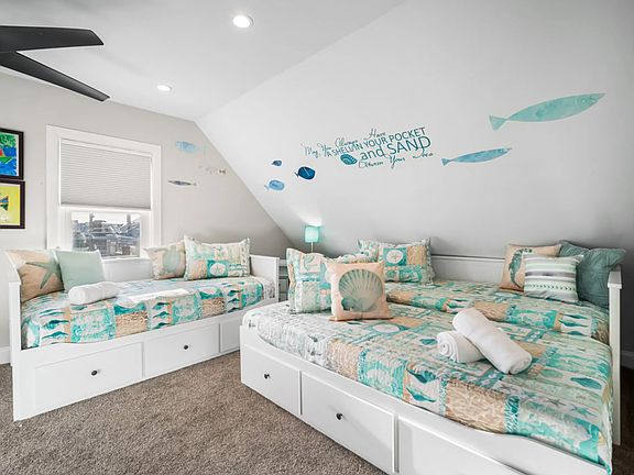 Retreat to one of three beautifully appointed bedrooms, each thoughtfully designed to ensure a restful night's sleep. The first bedroom is on the 2nd floor with a queen bed, nightstands, and clothing storage. The first of two bathrooms is just outside this door. It features a stunning glass vanity, tiled floors, and bathtub with tiled surround. On the 3rd floor, you'll find the master suite and kids room. The master suite boasts a comfortable queen-sized bed, two comfy loungers, a 65" smart TV, and a desk with desk chair, lamp, and plenty of nearby outlets. The kids room hosts 3 twin beds, and plenty of clothes storage. The second of two bathrooms is just outside these bedrooms. It features a double vanity, tiled floors, and a glass enclosed shower with tiled surround.