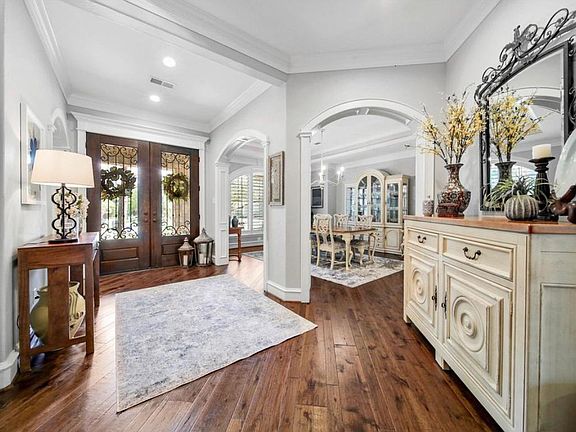 Sparkling pool and spaWood flooringLush private backyardPrivate guest suiteFive bedroomsInterior brick accentsCrown molding