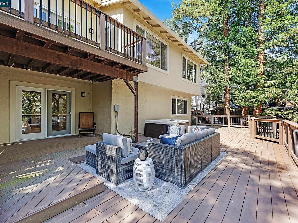 Tucked away on a quiet cul-de-sac and framed by a lush backdrop of mature trees, this 3-bed, 2.5-bath, appx. 2079 square foot two-story single-family home is a private retreat just minutes from the Contra Costa Country Club Golf Course. Step outside to not one, but two Trex decks, which are perfect for morning coffee surrounded by nature or evenings unwinding in your private jacuzzi under the stars. On the main level, natural light pours through the skylights and expansive picture windows, framing mature oaks and a seasonal creek. The heart of the home—a beautifully updated kitchen- offers the ideal blend of modern style and everyday functionality, ready to inspire your inner chef. Downstairs, you will love relaxing in the ample-sized primary bedroom retreat, which offers access to the back deck, a spa-like bath, a large walk-in closet and a convenient utility/laundry room with plenty of space for storage. Live near Hidden Lakes Park, Paso Nogal Dog Park, Diablo Valley College, shopping, excellent public schools, and freeways. Whether you're entertaining on the deck or enjoying a quiet moment with nature, this home offers a lifestyle that’s both connected and serene.