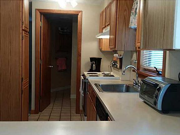 Spacious 2 bed split level home featuring huge double living room, fully applianced tile kitchen and hardwood floors in dining area with sliders to deck. Knotty pine basement with lavette . Garage with separate electric panel. New roof. Sold as-is.