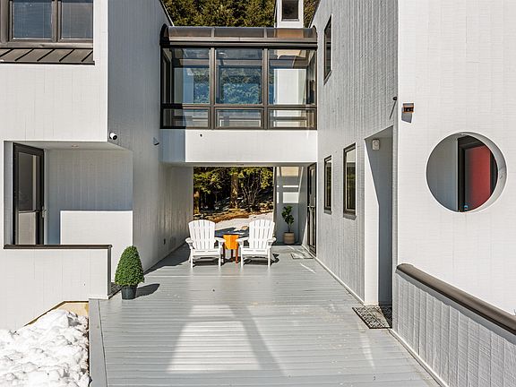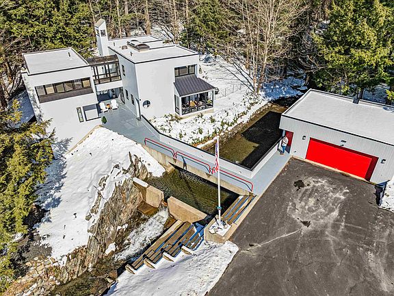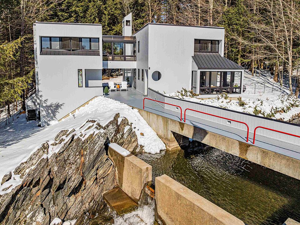 Tucked away in a tranquil neighborhood in Barre Town, this unique home will take your breath away. “Windbrook” was designed by renowned local architect Donald Mcknight as his personal residence. Boasting the style of Frank Lloyd Wright, this mid-century modern meets Bauhaus home is comprised of 2 separate pavilions connected by a second level glass domed walkway. Begin by walking across the bridge that extends across a moat and winding brook with cascading falls. Entering the main building, you'll find a convenient mudroom with laundry. An updated kitchen down the hall is filled with natural light that pours in through the adjoining sunroom. As you walk through the home, you'll enter the open dining & living rooms, perfect for entertaining. A cozy gas fireplace with mantle warms the space, & you can spot deer from the windows overlooking the back woods. A 1/2 bath completes the first floor of the main building. Upstairs boasts 2 large bedrooms, including the primary, each with a private bath. Across the glass walkway, you'll find a flexible office & bonus room. An updated & efficient kitchen is down the stairs on the first floor, as well as a cozy living room. A 3/4 bath completes the second building. Permitting is currently underway to make this side an accessory dwelling unit. Outside, soak in the sounds of nature on the expansive deck and enjoy your private oasis. Stroll along the peaceful neighborhood streets, while being minutes drive from town and city amenities.