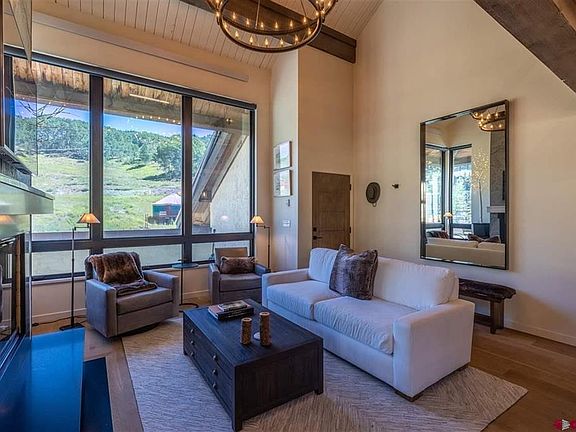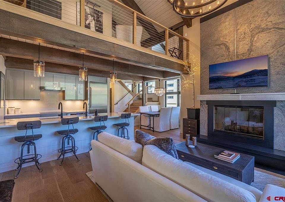 Wow! What an incredible spot on the ski slopes! This offering is a one-of-a-kind mountain retreat featuring an incomparable ski in-ski out location next to Crested Butte's main high speed quad lift: The Silver Queen. Renovated from the studs and completed in 2019, the home now features a raised second floor level creating 18-foot ceilings in the great room. During construction, structural and exposed oak beams were added along with the whitewashed tongue-and-grove wood ceilings, in-floor heating, new plumbing and electrical systems, new energy efficient windows and top of the line motorized Lutron blinds and Hunter Douglas Silhouttes. The interior enjoys Restoration Hardware furnishings and lighting, a Camino Vintage Candelabra 2-tier chandelier and a custom wood-burning fireplace with a white quartz mantle on a black granite hearth. The dining area seats six and is adorned with a spectacular 1920s 3-Tier Odeon Crystal Fringe chandelier. The kitchen footprint and cabinetry is complimented by stunning UltraLux contemporary high-gloss cabinets, under-cabinet lighting, Thermador stainless appliances, and white quartz stone countertops with an island bar with seating for four. The modern staircase sports a custom iron and oak banister with cable railing and wide plank white oak steps and risers. There are two well appointed primary bedrooms with beautiful ensuite baths. The lofted space currently functions as a second living area. Outside, the spacious Trex deck features a hot tub, a storage closet and a dramatic view of the skiing and the peak like no other.