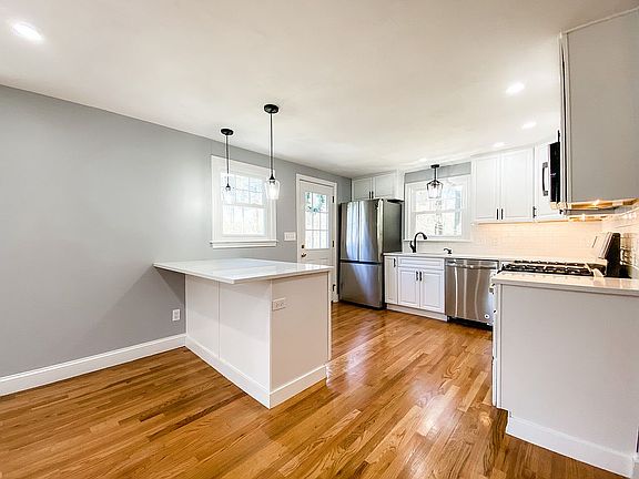 This updated cape-style home is located in a neighborhood on a near-acre lot. The recent reno includes new roof, gas water heater, A/C, windows, kitchen & baths, vinyl siding, exterior & interior paint, hardwood floors, carpet, septic & finished sunroom. The open concept designer kitchen & dining room features white cabinets & quartz countertops, subway tile backsplash & a kitchen island. The beautiful hardwood floors connect you through to the front-to-back living room with a fireplace. Off the living room is the sunroom, great for a home office or playroom. The 1st-floor bathroom has been updated with a tiles tub, new vanity, & new fixtures. Upstairs you'll find a front-to-back main bedroom with new carpet, 2 ample sized bedrooms, and a renovated bathroom with floor to ceiling tiled shower, new vanity, and all new fixtures. Located within close proximity to schools, library, fields, town common, and more! OH Fri 5/6 5-6:30, Sat 5/7 12-2, & Sun 5/8 12-1:30. Offers due Mon 5/9 by 5 PM